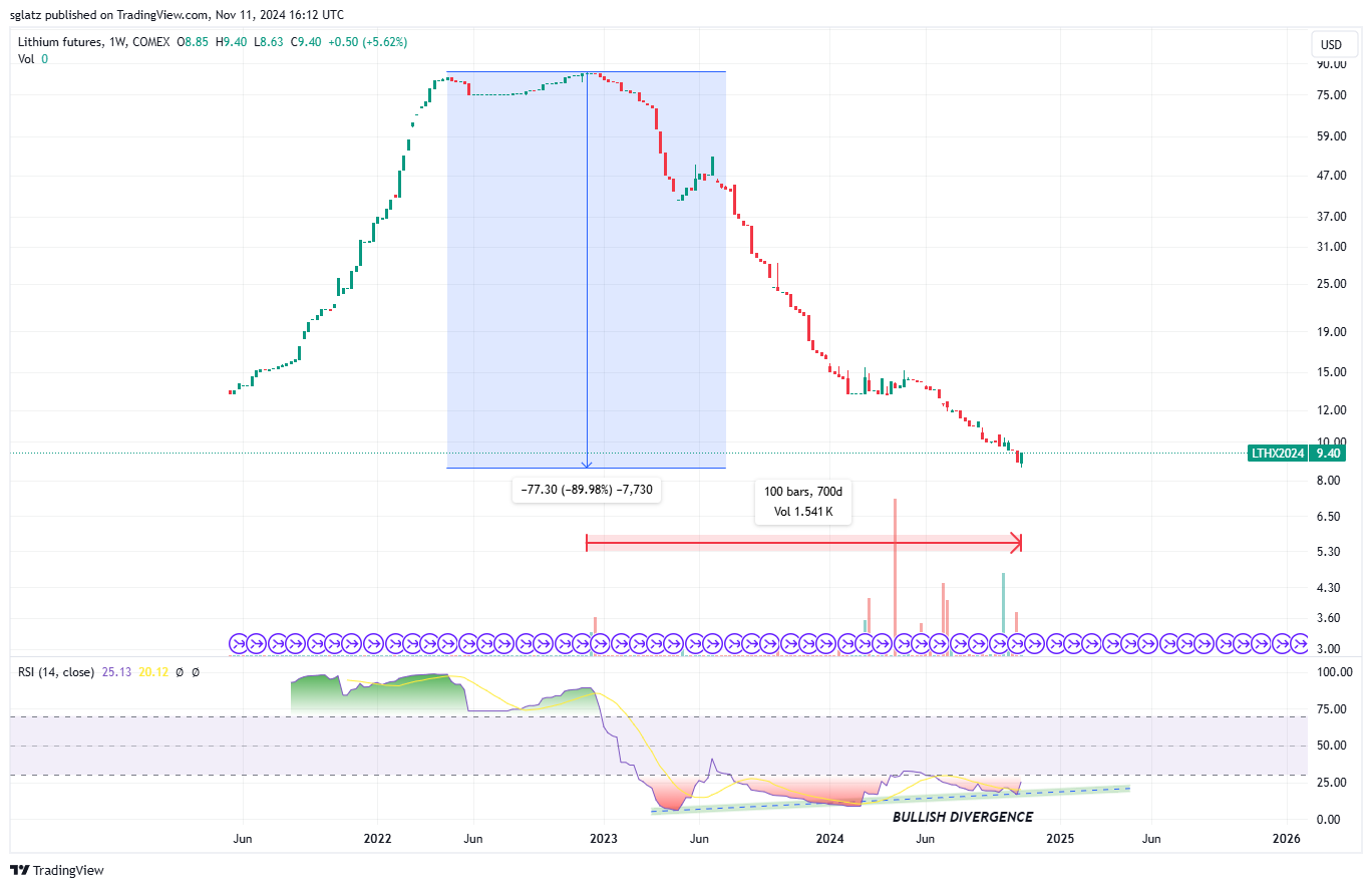 This is what complete agony looks like, if you’ve been riding the sector all the way down. On the other hand, this is what a screaming buy opportunity looks like, if you’ve been waiting patiently to buy at cycle lows. We think it’s time to begin aggressively positioning in the sector, based on Lithium futures pricing, which is confirming a major bottom. Lithium futures are down 90% off recent highs and have gone almost straight down for 100 weeks, but are showing bullish divergence - this creates incredible buying opportunities in assets that are steeply discounted.
